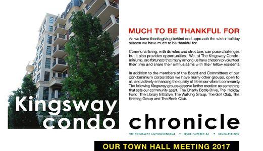 The Chronicle newsletter is published by the Communications Committee quarterly. It is your source for news and information about our community and the many Board and Management initiatives. Send an email request for email delivery. propertymanager@thekingswaycondo.com